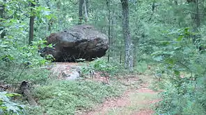 The geology and natural environment of the M&M trail can be divided into two distinct sections: the Metacomet Ridge of the Pioneer Valley and the upland plateau of central Massachusetts and southern New Hampshire. One common denominator, evidence of recent glacial activity, can be found throughout all parts of the M&M Trail. Such evidence includes glacial erratics, glacial scouring, glacial striations, deranged drainage, mountain notches, U-shaped valleys, highland swamps, and roches moutonnées, so called "sheepback mountains" because they often resemble the shape of a sheep in profile. The extremely steep south and/or east faces of these hills were carved by the movement of glacial ice down lee slopes.[8]
