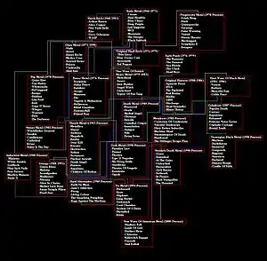 The chart from the film documents Dunn's view on the progression of subgenres of metal that have spawned over time as well as other styles of rock (i.e. hard rock, shock rock, punk rock, and hardcore) that have influence these styles of metal, while also attempting to list the prime examples of bands that fall into each category. Below is a typed version of that chart, which can be found on the second disc of the film's special edition DVD package. A new version was presented in the related TV series Metal Evolution which included a new "Pre-Metal" field that listed non-metal bands that had an influence on heavy metal and also listed additional bands as examples of the various subgenres.