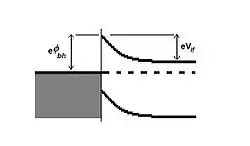 where and are the electronegativities of the metal and semiconductor, respectively. The charge transfer produces a dipole at the interface and thus a potential barrier called the Schottky barrier height. In the same derivation of the branching point mentioned above, Tersoff derives the barrier height to be:
