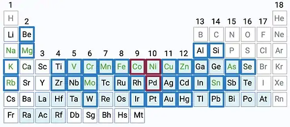 Nickel allergy and allergies to mercury and chromium have long been recognised; gold, palladium, and cobalt have gotten attention more recently.[2][3] There is often cross-sensitization, where a person allergic to one metal may become allergic to another, but monosensitization, reacting to just one metal, is also possible.[4] For instance, many people allergic to nickel are often also allergic to cobalt (a similar element often found in the same places as nickel) and palladium. But it is also possible to only be allergic to one of these metals.[1]