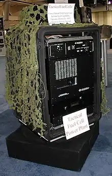 During the earlier phases of product development, there was a focus on single fuel cells and fuel cell stacks composed of multiple cells. The target applications included critical backup power for military and commercial applications.[13] The next phase was to design and build complete fuel cell systems that could be taken outside of the laboratory. Initial 50 Watt laboratory-based demonstration systems were integrated into 50 Watt portable systems with more robust packaging and interfacing.[12] Additional developments in both the fuel cell stack and system integration enabled a 1.0 kW system, complete with an inverter and onboard hydrogen storage using metal hydride storage canisters, to be operated and demonstrated in public.[6][14] Further developments in metal hydride fuel cell systems were pursued for the field power needs of soldiers, resulting in a prototype system meeting deployment requirements.[15] In tandem with product development, there was also a focus on developing capabilities for manufacturing and testing.[16] Metal hydride fuel cell systems have been integrated into microgrid systems at military bases for testing and evaluation.[17] Despite challenges,[18] the military maintains an active interest in fuel cells for a broad range of applications, including unmanned aerial vehicles, autonomous underwater vehicle, light-duty trucks, buses, and wearable technology systems.[19][20][21][22] Development of metal hydride fuel cell systems is continuing for military applications, with onboard hydrogen generation and fuel cells up to 5.0 kW.[23][24]