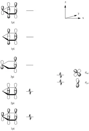 Metallabenzene complexes have been classified into three varieties; in such compounds, the parent acyclic hydrocarbon ligand is viewed as the anion C5H5−. The 6 π electrons in the metallacycle conform to the Hückel (4n+2) theory.[3]