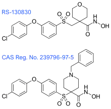 These inhibitors were followed by the next group of hydroxamate-based inhibitors, which focus on the suppression of metabolism, minimization of MMP-1 inhibitory activity and the control of subtype selectivity, by structure-based design. The tetrahydropyran in RS-130830 introduces a steric block that suppresses metabolism, which would fix the problem that the previous generation of inhibitors showed. The outcome of its clinical evaluation has not yet been disclosed. 239796-97-5 has improved ADME and MMP-1 selectivity properties and has shown excellent oral efficacy in an animal model of osteoarthritis. Although, the therapeutic objectives for these inhibitors is not cancer, like it has been for most of the MMP inhibitors.[7]