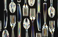 Cutlery (also referred to as silverware, flatware, or tableware), includes any hand implement used in preparing, serving, and especially eating food in Western culture. A person who makes or sells cutlery is called a cutler. The city of Sheffield in England has been famous for the production of cutlery since the 17th century and a train – the Master Cutler – running from Sheffield to London was named after the industry.[1] Bringing affordable cutlery to the masses, stainless steel was developed in Sheffield in the early 20th century.[2]