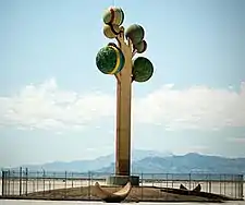 Metaphor: The Tree of Utah, sometimes called the Tree of Life, is an 87-foot-tall (27 m) sculpture that was created by the Swedish artist Karl Momen in the 1980s and dedicated in 1986. It is located in the desolate Great Salt Lake Desert of Utah on the west bound side of Interstate 80, about 25 miles (40 km) east of Wendover and midway between the former railroad communities of Arinosa and Barro. The sculpture, which is constructed mainly of concrete, consists of a squarish 'trunk' holding up six spheres that are coated with natural rock and minerals native to Utah. There are also several hollow sphere segments on the ground around the base. The sculpture currently has a fence surrounding the base to protect people from falling tiles.[1]