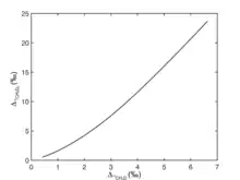 Mixing between end-members with different conventional carbon and hydrogen isotope compositions (i.e. δ13C, δD) results in non-linear variations in or . This non-linearity results from the non-linear definition of and values in reference to the random distributions of methane isotopologues ( and , as in "Notation"), which are non-linear polynomial functions of δD and δ13C values. Such non-linearity can be a diagnostic signature for mixing if multiple samples of various mixing ratios can be measured. When end-members have similar δ13C or δD compositions, the non-linearity is negligible.[4]