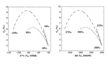 Based on these correlations, , and can be used as a geothermometer to indicate the formation temperature of methane (, and ). And the correlation of and can help to determine whether methane is formed in internal isotopic equilibrium.[12]