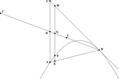 Suppose the line segment AC is parallel to the axis of symmetry of the parabola. Further suppose that the line segment BC lies on a line that is tangent to the parabola at B. The first proposition states: