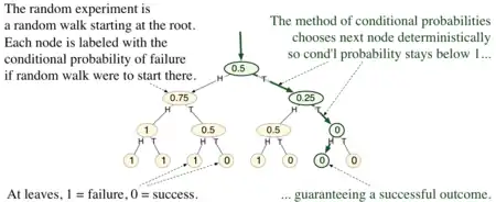 The method of conditional probabilities replaces the random root-to-leaf walk in the random experiment by a deterministic root-to-leaf walk, where each step is chosen to inductively maintain the following invariant: