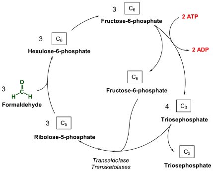 Like the RuBP cycle, this cycle begins with 3 molecules of ribulose-5-phosphate. However, instead of phosphorylating ribulose-5-phosphate, 3 molecules of formaldehyde form a C-C bond through an aldol condensation, producing 3 molecules of 3-hexulose 6-phosphate (hexulose phosphate). One of these molecules of hexulose phosphate is converted into GAP and either pyruvate or dihydroxyacetone phosphate (DHAP). The pyruvate or DHAP is used towards biomass while the other 2 hexulose phosphate molecules and the molecule of GAP are used to regenerate the 3 molecules of ribulose-5-phosphate.[6][22]