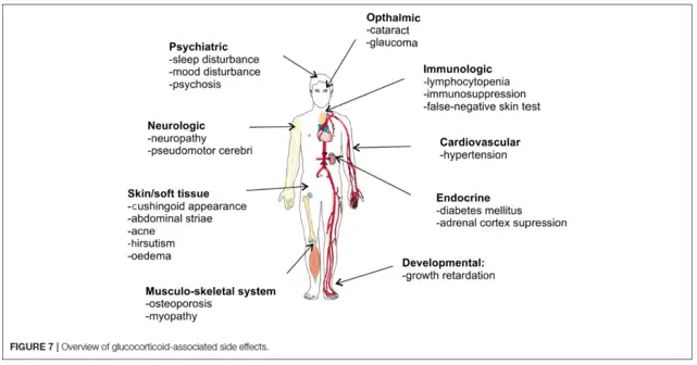 Ophthalmic: posterior sub-capsular cataracts, increased intraocular pressure, glaucoma, and exophthalmos.[20]