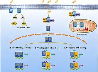 Previous studies identified mGRs in lymphoma cells, but it wasn't until 2004 that mGRs were identified in human peripheral mononuclear cells.[16] The prevalence of mGRs ranges per cell type, with the highest concentration in B lymphocytes at up to 12.3%, up to 9.2% in monocytes, and absent from T lymphocytes.[16] Studies have shown a positive correlation between the mGR-positive cells and disease related activity.[16] There are no proven signaling pathways associated with mGR at this time. Some researchers hypothesize that high disease activity activates mGR expression and upon administering methylprednisolone, creates a negative feedback loop by inducing apoptosis.[16]