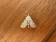 The wingspan is about 15 mm. Adult are white with dark brown dots and lines and pale brown blobs.[5]