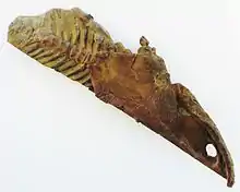Metoposaurus meaning "front lizard" is an extinct genus of stereospondyl temnospondyl amphibian, known from the Late Triassic of Germany, Italy, Poland, and Portugal.[1][2] This mostly aquatic animal [3] possessed small, weak limbs, sharp teeth, and a large, flat head.[4] This highly flattened creature mainly fed on fish, which it captured with its wide jaws lined with needle-like teeth. Metoposaurus was up to 3 m (10 feet) long and weighed about 450 kg (1,000 pounds).[4] Many Metoposaurus mass graves have been found, probably from creatures that grouped together in drying pools during drought.