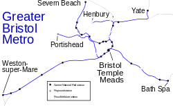 MetroWest, formerly known as the Greater Bristol Metro, is a project to improve the rail services in Bristol, England, and the surrounding region. It was first proposed at First Great Western's Stakeholder Event in March 2008.[2] The aim of the project is to develop half-hourly services through central Bristol which will also serve the surrounding West of England region.[3] Transport campaigning groups Friends of Suburban Bristol Railways (FoSBR) and Transport for Greater Bristol are actively supporting the proposal, [4][5] as are the three unitary authorities under the West of England Combined Authority[6][7] and North Somerset Council.