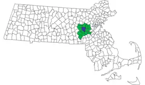 ![]() Map of the MetroWest Regional Transit Authority (MWRTA) service area in green with the central hub town of Framingham in blue. | |