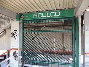 Aculco is a station along Line 8 of the metro of Mexico City.[2][3][4] It is located under the bridge where the Trabajadoras Sociales (Eje 6 Sur) passes over the Eje 3 Ote in the Colonia Pueblo Aculco neighborhood of the Iztapalapa borough of Mexico City.[2] The station's logo is a water wave in a canal.[2] In Nahuatl it means "where the water twists".[2] The name is also the name of the Aculco municipipality in the State of Mexico.[2]