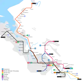 The main station of the network is Zazpikaleak/Casco Viejo, the only one in which all three lines meet.[10] Since line 3 is operated as part of the wider Euskotren Trena network, the station is also the main hub for Euskotren's commuter railway services in Bilbao. Other important interchange stations are Abando (connections to Cercanías and Feve commuter railway lines and Renfe's long distance services) and Santimami/San Mamés[11] (connections to Cercanías and the main bus terminal). Urbinaga station on line 2 was built as a future interchange station with two Cercanías commuter rail lines. However, as of 2021, the commuter rail station is not yet built, having been postponed several times.[12]