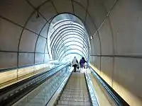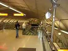 Large caverns of a 160m2 cross section were dug for stations, creating large open spaces, as opposed to the traditional sets of linked tunnels. For example, the ticket line is in the same space as the trains, for this purpose steel structures called 'mezzanines' have been built over the tracks. Trains are fully accessible by lifts and escalators. Materials such as steel and concrete have been used throughout.