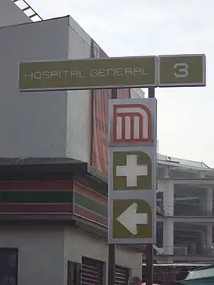 The station logo represents the symbol of International Red Cross.[2][3] Its name refers to the General Hospital of Mexico, which is located above the station.[2]
