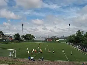 The Metropolitan Oval, also known as Met Oval, is a soccer complex located in Maspeth, Queens in New York City. Village Voice named the complex, which takes up 4.2 acres (17,000 m2), the "Best full soccer field in the middle of a residential neighborhood" in 2004, for its "pristine" playing surface and the view of the Manhattan skyline.[1]
