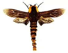 Male wingspan 40-63 mm, generally charcoal to black, head and thoracic regions with yellow or orange scales. Exact pattern of thorax, as well as genitalia, are diagnostic to species.[1] Antennae bipectinate to apex, eyes small, legs short, foreleg epiphysis can be present or absent, wing scales mainly class 6, wings with M present in discal cell. Forewing with wing veins Rs2 and Rs3 fused with M2 and M3 from the same stalk, CuP and A fused. Hindwing with Sc, R, and Rs1 fused, M2 and M3 arising closely, CuP free, 3 anal veins present.[1]