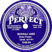 Autry recorded "Mexicali Rose" on December 24, 1935[2] at the American Furniture Mart ARC Studios, 666 N Lake Shore Drive, 21st Floor, Chicago. Autry was still considered a hillbilly or folk artist, and his recordings were released on ARC's discount labels: these were Melotone 6-05-59[2] and Perfect 6-05-59[2] in April 1936, and later that year on Conqueror 8629[15] and Vocalion 3097.[16] The song was included in the 1939 film Mexicali Rose starring Autry.[17]