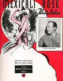 Between the 1923 publishing and the mid-1930s revival of "Mexicali Rose", composer Jack Tenney and publisher W. A. Quincke of Los Angeles transferred their interests to the M.M. Cole Company of Chicago.[24] Crosby had performed the song on his Kraft Music Hall radio show on March 31, 1938. He recorded the song for Decca Records on July 11, 1938,[25][26] and his version achieved success the same year.[27] Crosby recorded the song again for his 1954 album Bing: A Musical Autobiography.[28][29]