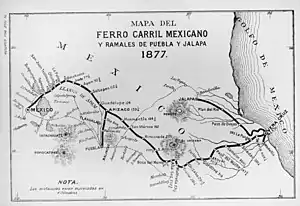 The main line from Mexico City to Veracruz was dedicated on January 1, 1873 by President Sebastián Lerdo de Tejada; branches connected Ometusco to Pachuca and Apizaco to Puebla.[2][3] The 103 kilometers (64 mi) between Esperanza and Paso del Macho were electrically operated beginning in the 1920s.[4][5]