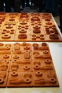 Pre-Hispanic vessels were shaped by modeling, coiling or molding. Except for a proto wheel used by the Zapotecs, the potter's wheel was unknown until the Spanish Conquest. Simple pinch pots or coiled pots were usually made by the family, with larger molded pieces made by craftsmen.[3] The earliest molded pieces were simply clay pressed against a pre-existing bowl, but double molds and slip casting came to be used to make bowls with relief decorations. Famous examples of this type exist in Tlaxcala and Puebla states.[4] Many figurines were also made using molds. Sometimes vessels were made with several molded pieces with the upper part finished by coiling.[4]
