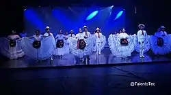 [1]Folk dance of Mexico, commonly known as baile folklorico or Mexican ballet folk dance, is a term used to collectively describe traditional Mexican folk dances. Ballet folklórico is not just one type of dance, it encompasses each region's traditional dance that has been influenced by their local folklore and has been entwined with ballet characteristics to be made into a theatrical production.[2] Each dance represents a different region in Mexico illustrated through their different zapateado, footwork, having differing stomps or heel toe points, and choreography that imitates animals from their region such as horses, iguanas, and vultures.[3]