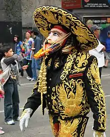 Dances which parody Europeans, especially rich hacienda owners, are most commonly performed for Carnival. One of the most widespread of these is the Chinelos, danced in the State of Morelos.[7] In Tlaxcala, for the Dance of the Catrines (Dandies), performers wear masks with pale skin tones, and hold up umbrellas as a petition for rain. Wearing top hats and coats, they also make fun of wealthy landowners.[30]