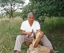 Traditional masks are still handcrafted. Most traditional communities have one person who specializes in the craft. This person is almost always male who has learned the trade from his father, with the occasional exception of a widow continuing her husband's trade.[34][37] Some mask makers specialize in those for a particular dance.[38] Mask makers are respected as they need to know the significance of each dance to make the appropriate masks.[34] Most mask makers have other occupations such as baker, wax worker, factory worker or carpenter.[39] A number of mask makers are also makers of religious images called “santeros.” These craftsmen tend to make masks with fine features and finishes that imitate human skin.[33][34] Production is aimed almost exclusively to dancers, although they are also made for collectors, and more fantastic ones for the tourist market, especially in Guerrero.[34] It can be difficult to distinguish these masks from more “authentic” ones for dances.[28] In a few communities, there is enough demand to have full-time mask makers, where hundreds are worn for major festivities.[28][39] One of these is Tlaxcala because almost all dancers are masked. Many of these are made in the town of Apetatitlán de Antonio Carvajal by the Carlos Reyes Acoltzi family and the Mendez family of the city of Tlaxcala . Another area with a high demand for masks is Chiapa de Corzo, for the Parachicos dance performed for the feast of Saint Sebastian by thousands of dancers. The best known mask maker of this type is Antonio López, who also teaches the trade to young people.[39] There are still cases where dancers make their own mask, such as the Cora in Nayarit and the Mayo and Yaqui in Sinaloa and Sonora. These are not generally made of wood.[18][28] In the Cora community, dancers are bound to make their own masks as part of the rituals for Holy Week from papier-mâché, painted white and bound with cloth. On Holy Wednesday, it is worn this way. On Maundy Thursday, black lines are added and then dyed on Good Friday.[28]