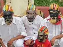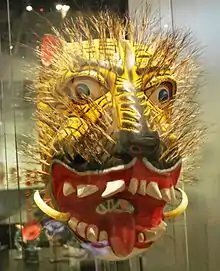 Masks range from the crude to ones with detail to make them seem like real faces.[45] Most masks are scaled to fit the human face, with dancers looking out slits just above the painted eyes.[9] The smallest masks measure between ten and fifteen centimeters wide with the rest of the face, including the mouth, covered by cloth.[46] Other masks are much larger than the face, with the wearer looking out the mouth of the mask.[9][47] Some masks have movable parts such as lips, tongue and eyelids to make them more animated.[9][48]