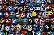 Today, most mask use is related to celebrations and rituals, although modern images and new variations have entered modern popular culture. Traditional masks have been carved with images of figures such as Pedro Infante and Cantinflas .[20] The influence of Halloween from the United States has resulted in the appearance of commercially made masks for the days around Day of the Dead.[21] Masked characters appear in comics, television and movies such as El Chapulín Colorado and Karmatron. However, the most important use of masks in Mexican popular culture are those associated with lucha libre, or professional wrestling.[22] Here, the mask is a symbol of the wrestler's professional identity. They are made of fabric and envelope the head as well as the face, with plastic reinforcement around the eyes and mouth. The designs are unique to the wrestler and they fight to defend this identity. A number of these masks have been passed down from father to son, such as those of El Santo, Blue Demon, Los Hermanos Dinamita, Tinieblas and Dos Caras. In the case of a bout called “lucha de apuestos” the loser loses his mask and his real face is revealed. After this, the mask can never be used again.[23] L