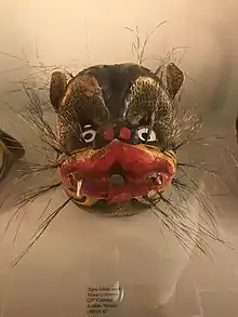 The use of masks and costumes was an important part of Mesoamerican cultures for long before the arrival of the Spanish. Evidence of masks made with bone thousands of years old have been found at Tequixquiac, State of Mexico.[1] These masks had various uses but always in connection to ceremony and ritual especially in theatrical dance and processions.[2] Masks were used by high priests to incarnate deities.[2][3] Jaguar and eagle warriors dressed themselves like these animals in order to gain their strengths.[2][4] Funeral masks were reserved to the burials of the very elite such as that of King Pakal and were works of art, made of jade, shell, obsidian, hematite and other precious materials of the time.[5] Masks used in theatrical performances and dances varies widely from the various animals of the Mesoamerican world, to those of old men and women generally for comedic relief to those designed to make fun of neighboring ethnic groups.[2] Some of the ancient masks made of stone or fired clay have survived to the present. However, most were made of degradable materials such as wood, amate paper, cloth and feathers. Knowledge of these types comes from codices, depictions on sculptures and the writings of the conquering Spanish.[3][6] Indications also exist with the survival of a number of dances from the pre- Hispanic period such as Tecuanes, Tigres and Tlacololeros.[7]