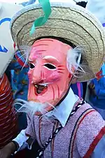 Dances with old men or women character have dancers that are masked, with origins to the pre Hispanic period.[57] These masked dancers may represent the elders of the village or the ancestors.[25] In the Valley of Mexico, an old man can represent the god of fire, Huehueteotl, especially in relation to the New Fire Ceremony.[25][58] In a version of the dance in Michoacán, the depiction of the elderly is also dignified, with the Danza de los Viejitos performed on major days of the Catholic calendar, especially between Christmas and Candlemas.[25][58]