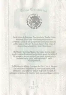 - "La Secretaría de Relaciones Exteriores de los Estados Unidos Mexicanos solicita a las autoridades competentes que permitan al titular de este pasaporte de nacionalidad mexicana su libre paso sin retraso u obstáculo alguno y, dado el caso, le otorguen toda la asistencia y protección posibles."
