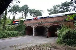 Trams were already well established in the area which led the Bournemouth Guardian newspaper to comment that, although the new station would be useful to golfers, the residents of Winton would most likely continue using the trams which were perceived as more flexible.[1] Local residents had in fact petitioned the LSWR for a station as early as 1894, but it is thought that even if one had been provided, its patronage would have been mostly lost to the trams in any case.[1] On 17 June 1914, 280 members of the Boscombe Corps of the Salvation Army made the short 1-mile-72-chain (3.1 km) trip from Meyrick Park Halt to Boscombe on the 7:40pm service from Bournemouth West to Christchurch.[7] This was probably the greatest number of people to ever board a train here; the railway company provided a conventional four coach train in place of the usual push-pull train, and a member of staff from Bournemouth Central was stationed at the halt to supervise boarding.[7]