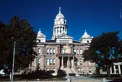 The Miami County Courthouse is an historic building in Troy, Ohio, United States. Built in 1885, it was designed by noted Ohio (and later New York) architect Joseph W. Yost, who also designed the similar Belmont County Courthouse built at the same time in St. Clairsville. It has high arched windows and Corinthian columns supporting the outthrust corners and main entrance. A flight of stairs runs to the main entrance. The central pediment rests on an arch supported by Corinthian columns. The corners of the building thrust out and support a pediment, on top of each rests a tower crowned with an urn-shaped finial. A central tower rises from the middle of the building supporting the clock tower and dome, and a statue of justice stands at the very top.[1]