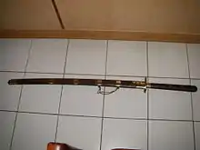 The miaodao (苗刀) is a Chinese two-handed dao or saber of the Republican Era, with a narrow blade, long hilt, and an overall length of 1.2 metres (47 in) or more. The name means "sprout saber", presumably referring to a likeness between the weapon and a newly sprouted plant. An early reference, in Jin Yiming’s Single Defense-Saber, makes a connection between the miaodao and the Qing-era wodao, as well as mentioning both single and two-handed versions of the ‘’miaodao’’, suggesting that the name originally described the shape only, without any connotations of size. While the miaodao is a recent weapon, the name has come to be applied to a variety of earlier Chinese long sabers, such as the zhanmadao and changdao. Along with the dadao, miaodao were used by some Chinese troops during the Second Sino-Japanese War.