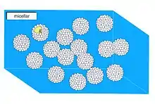 A micellar solution consists of a dispersion of micelles in a solvent (most usually water). Micelles consist of aggregated amphiphiles, and in a micellar solution these are in equilibrium with free, unaggregated amphiphiles. Micellar solutions form when the concentration of amphiphile exceeds the critical micellar concentration (CMC) or critical aggregation concentration - CAC, and persist until the amphiphile concentration becomes sufficiently high to form a lyotropic liquid crystal phase.[1][2][3][4]