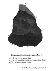 Michał Plater-Zyberk also sent fragments of the meteorite to Ignacy Horodecki, at the University of Vilnius, who in turn passed it on through Alexandre Brongniart, a member of the Academy of Sciences in Paris, to André Laugier, a specialist in meteorites. André Laugier conducted research on the meteorite, which he published in 1823-1824. Some fragments of the meteorite were also donated to Warsaw University in February 1828 by Kazimierz Plater-Zyberk, son of Michał.[4]