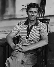 Michael Andrews was born in Norwich, England, the second child of Thomas Victor Andrews and his wife Gertrude Emma Green. During his last year at school Andrews attended Saturday morning classes at the Norwich School of Art where he studied painting in oils with Leslie Davenport.[1] He completed his National service between 1947 and 1949, nineteen months of which was spent in Egypt.[2] From 1949 to 1953 he studied at the Slade School of Fine Art under William Coldstream, Lucian Freud, William Townsend and Lawrence Gowing.[3] Fellow students and friends there included Victor Willing, Keith Sutton, Diana Cumming, Euan Uglow[4] and Craigie Aitchison. In 1953 he spent six months in Italy at the British School at Rome after receiving a Rome Scholarship in Painting.