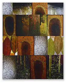 James’s wife Judith was diagnosed with younger onset Alzheimer’s Disease in 2009.[74] A “movingly poetic” and “gently resigned”[75] body of work emerged from his experiences with the progression of her illness that culminated in a solo exhibition at the International Quilt Museum in Lincoln from June 2015 to February 2016.[76] The exhibition, “Ambiguity & Enigma,” was credited by Wolgamott as being James’s “best, most powerful exhibition this writer has seen either in person or digital reproduction.” James had a similar assessment saying, “I’m very proud of this work. I think it’s the strongest body of work I’ve done to date. There’s a rightness and a kind of perfection in these pieces I’ve not achieved before. If it turns out to be a kind of coda, that’s fine.”[77] Judith died of the complications of the disease in August of 2015. They had been married 43 years.[78]