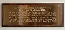 Upon the flight of provost Robert Huntington of Trinity College, Dublin, in 1689, Moore became the college's first Catholic provost. He acquired the post via the influence of Richard Talbot, Earl of Tyrconnell, to whom he was chaplain and confessor. The Catholic Encyclopedia states "The college was seized by the Jacobites, the chapel was made a powder magazine, one portion of the building was turned into a barrack, and another into a gaol for persons suspected of disaffection to the royal cause. .. He {Moore} upheld the rights of the college, secured it from further pillage, and endeavoured to mitigate the treatment of the prisoners. With the librarian, Father McCarthy, he prevented the soldiery from burning the library, and by preserving its precious collections rendered an incalculable service to letters."