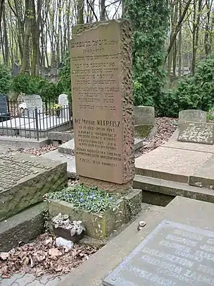 Michał Klepfisz was described by those who knew him as tall and thin, with a calm, quiet disposition.[19] He has a cenotaph in the Warsaw Jewish Cemetery on Okopowa Street (grave #39609),[20] with the inscription:
