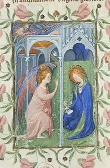 St. Luke Painting the Virgin is an illumination from a small Latin prayer book from 1420 which currently resides in the collection of the Morgan Library and Museum. This prayer book holds the majority of Michelino’s existing work, and its text, consisting of 47 prayers, was written in dark brown ink by a single scribe.[7] The book, now bound with 19th century velvet with silver clasps, includes 22 full-page illuminations with floral borders; however, half of the original miniature illuminations are now missing.[7] The illumination of St. Luke Painting the Virgin depicts St. Luke finishing painting a panel of the Virgin and Child, and is among the first Western representations of this scene. Later in the 15th century and throughout the remainder of the Italian Renaissance this subject became increasingly popular, for St. Luke was patron saint of painters and painters’ guilds.[8] Throughout the 15th, 16th, and 17 centuries, artists continued to propagate saintly artistic creation by showing St. Luke painting the Madonna and Child. Michelino's version features St. Luke standing as he works on a gable-topped panel, while in Georgio Vasari's 1565 fresco of the scene that resides in the church of Santissima Annuciata, St. Luke paints a portrait of an other-worldly sitter, who is also captured in Vasari's painting.[9]