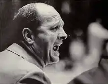 Bill Perigo took over the Michigan coaching job after having served three seasons as Western Michigan basketball coach. Despite previous success as a conference basketball champion coach at Western and subsequent success as a Michigan High School Athletic Association (MHSAA) champion basketball coach, his Michigan teams endured several mediocre seasons.[17] His best Big Ten records came in 1956–57 and 1958–59 when his teams compiled 8–6 conference records. The latter team was tied for second in the conference and was 15–7 overall (8–6, Big Ten).[19] It also had Perigo's only first-team All-Big Ten athlete in M. C. Burton.[18] Team captain and two-time football consensus All-American Ron Kramer was third-team All-Big Ten in 1957 after being second-team All-Big Ten in both 1955 and 1956.[18]