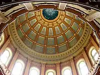 The Lansing capitol building inspired a national trend after the American Civil War for fireproof buildings, large enough to house expanding government as well as serving as a durable repository for artifacts of the war,[7] including battle flags that were moved to the Michigan Historical Museum in 1990. Over the years the dome, which at first matched the light tan of the building, was repainted a bright white. The legislature funded an extensive historical restoration starting in 1989 which was completed in 1992.[4] The restoration returned the dome to a creamy-white shade, upgraded mechanical systems, and improved accessibility as well as restoring many of the original design elements. One of the restoration's largest phases entailed removal of "half-floors" that were installed in 1969 to create 50,000 square feet (4,600 m2) of additional office space. The floors were created by dividing the 16-foot (4.9 m)-high rooms horizontally and creating a level of rooms which was accessed from the stairway landing. The Capitol Building was listed on the National Register of Historic Places January 25, 1971 (NRHP Reference #71000396), and was designated as a National Historic Landmark October 5, 1992.[8]